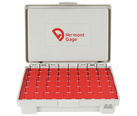 Vermont Class ZZ Black Guard Pin Set Black Guard Pin Gages include a black oxide treatment that helps prevent corrosion and also shows gage wear, saving money and time. The Black Guard black oxide treatment typically penetrates 0.00004" - 0.00006" deep, which will visually reveal wear patterns allowing the inspector to calibrate or replace the gage pins more effectively. Black Guard treatment will also help prevent rust and corrosion which will extend the useful life of the gage. Features include... .0060 - .0600" Range 55 pc Set, .001" Increments GO - PLUS NO GO - MINUS 2" long 10 microinch finish or better Certificate of Accuracy or better Please specify PLUS or MINUS when ordering. PLUS (GO) tolerance = +0.0002" / -0.0000" MINUS (NO GO) tolerance = +0.0000" / -0.0002"