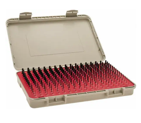 Vermont Class ZZ Black Guard Pin Set Black Guard Pin Gages include a black oxide treatment that helps prevent corrosion and also shows gage wear, saving money and time. The Black Guard black oxide treatment typically penetrates 0.00004" - 0.00006" deep, which will visually reveal wear patterns allowing the inspector to calibrate or replace the gage pins more effectively. Black Guard treatment will also help prevent rust and corrosion which will extend the useful life of the gage. Features include... .0115 - .2505" Range 50 pc Set, .001" Increments GO - PLUS NO GO - MINUS 2" long 10 microinch finish or better Certificate of Accuracy or better Please specify PLUS or MINUS when ordering. PLUS (GO) tolerance = +0.0002" / -0.0000" MINUS (NO GO) tolerance = +0.0000" / -0.0002"