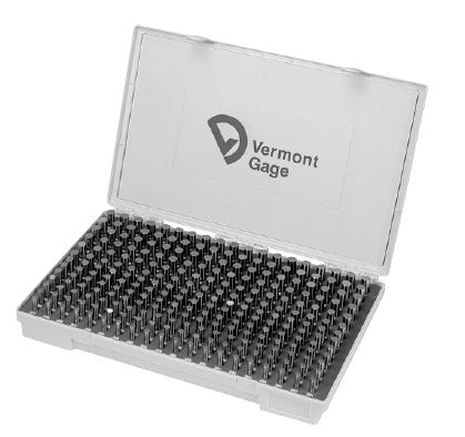 Vermont Class ZZ Steel Gage Pin Set Make quick and accurate measurements with Vermont Gage Pin gages. These pin gages allow you to measure hole sizes, calculate distance between holes, gage slot widths, and are perfect for GO / NO GO gaging. Features of this set include... .9170" - 1.0000" Class ZZ Gage Pin Set 84 Pieces in .001" increments 2" Overall Length A Certificate of Accuracy is included Boxes and Gages are both marked Each gage has a 10 microinch finish or better Please specify PLUS or MINUS when ordering. PLUS (GO) tolerance = +0.0002" / -0.0000" MINUS (NO GO) tolerance = +0.0000" / -0.0002"